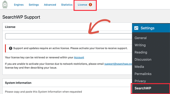 激活后,您需要访问设置 » SearchWP页面并切换到许可证选项卡以输入您的许可证密钥。