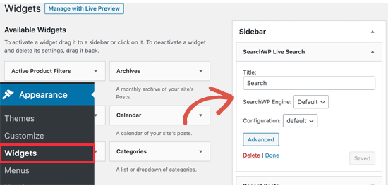 激活后,您只需转到外观»小工具页面并将“SearchWP Live Search”小工具添加到侧边栏。
