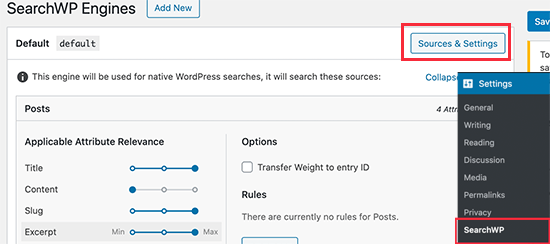 只需转到设置»SearchWP页面,然后单击“Sources & Settings”按钮。