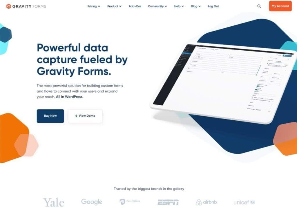 - Gravity Forms – 这是一款灵活的高级表单插件,除了许多官方附加组件外,它还有一个庞大的第三方扩展库。教育机构可能对将其与开发商的 Gravity Flow 插件搭配使用特别感兴趣,该插件可根据表单实现灵活的业务流程自动化。据 Gravity Forms 主页介绍,耶鲁大学和宾夕法尼亚州立大学等知名大学都在使用它。