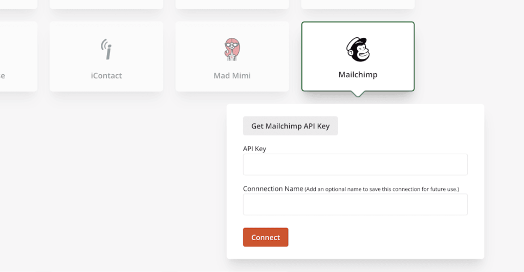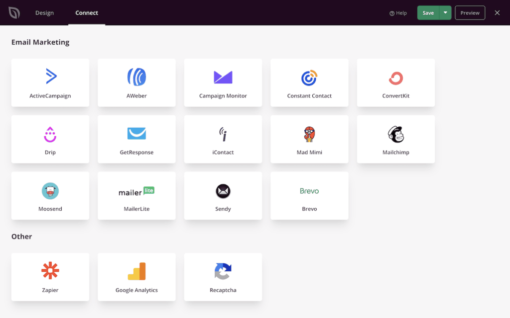 SeedProd 的另一个巧妙之处在于它是如何整合集成的!对于大多数其他插件和主题来说,你需要为每个附加组件进行典型的安装过程,然后使用其功能。但在 SeedProd 中,我喜欢你可以从生成器的 Connect 选项卡中访问这些集成: