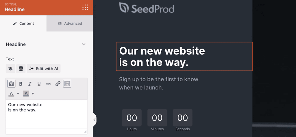 这里的关键词是“基本上”,因为当我在网站上工作时,我知道向数十名访客展示每一次迭代并不是一个正确的想法。最初,SeedProd 的维护页面解决方案满足了我的需求。只需点击一下按钮,我就可以弹出一个占位页,然后进行修补。