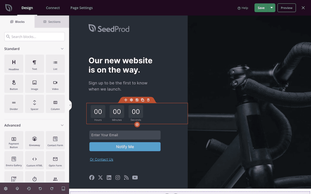 如果你已经使用过 Elementor 等页面生成器插件,你就会了解 SeedProd 自带的生成器。它在右侧提供了一个完整的实时预览,左侧侧边栏则是块和部分模板: