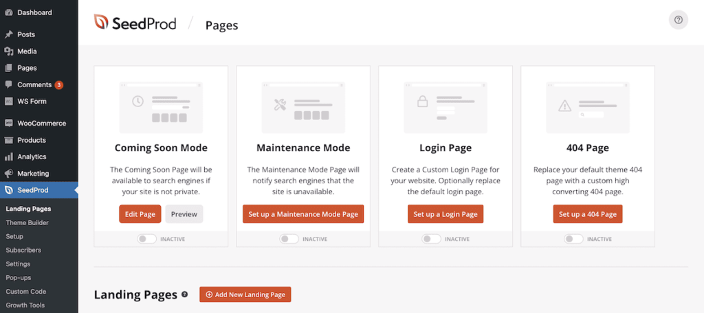 完成设计阶段后,保存更改,然后点击返回 SeedProd > Landing Pages。在这里,您可以激活“coming soon”和“maintenance”页面,并设置其他页面:
