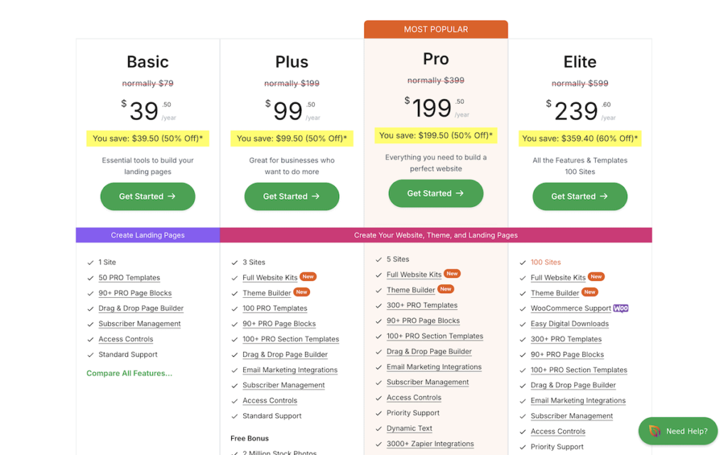 - Pro(每年 399 美元)。您可以获得五个网站许可证、Plus 级的所有功能、动态文本功能、Zapier 集成和优先支持。
