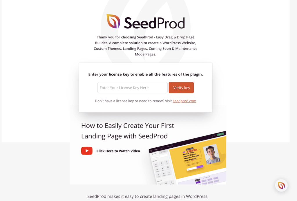 开始使用 SeedProd 非常简单,正如你所期望的那样。安装过程与高级插件相同,您还需要在 SeedProd > Settings 屏幕(或欢迎屏幕)中输入许可证密钥: