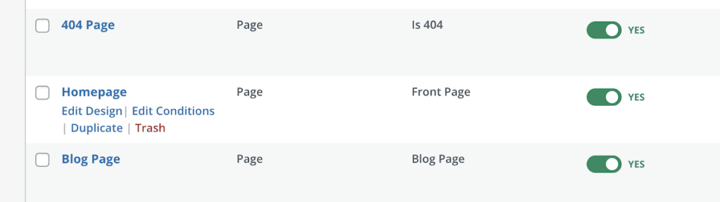 选择其中一个,主题模板列表就会出现。这些模板代表了页面的所有元素,如按钮、页眉、页脚和主页面。你可以对每个模板的设计和显示条件进行调整。后者是指模板属性的适用范围,如特定页面。