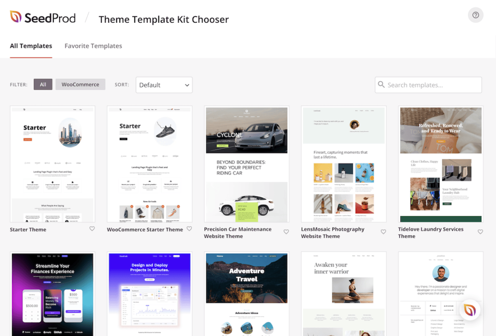 SeedProd 希望你能用它的工具建立一个完整的网站,所以它的过程很简单。在 Theme Builder 屏幕上,您可以从模板套件库中进行选择: