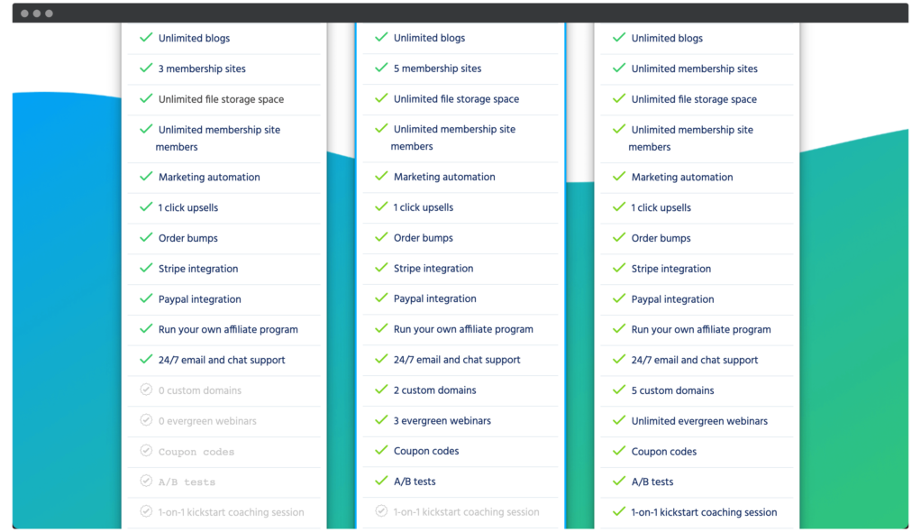 总的来说,这三个级别在功能和特性方面比较接近。无论您选择哪一种,您都可以获得几乎无限量的电子邮件、博客、销售漏斗、存储空间和会员订阅者。