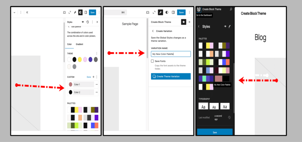 在下面的示例中,我们创建了一个包含两种颜色的新调色板,可应用于任何样式变体。左侧显示了为新调色板创建两种自定义颜色的过程。中间显示保存过程。右侧确认了新的自定义调色板。