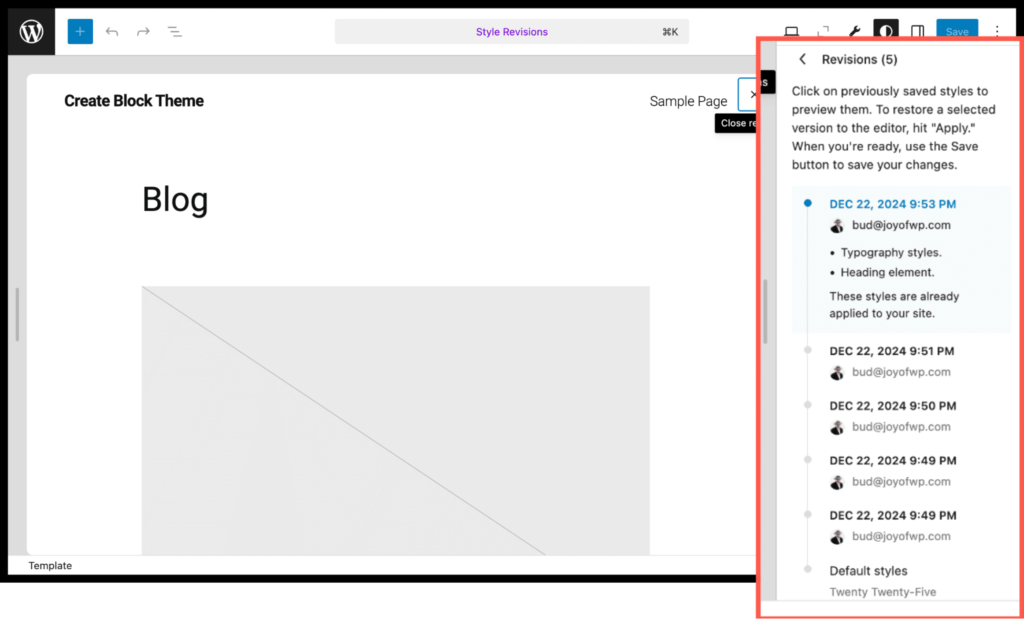 要想获得更强大的方法,您可以使用 WordPress 修订版本功能。这一内置功能提供了详细的更改历史记录,让您可以精确地将主题恢复到以前的状态。