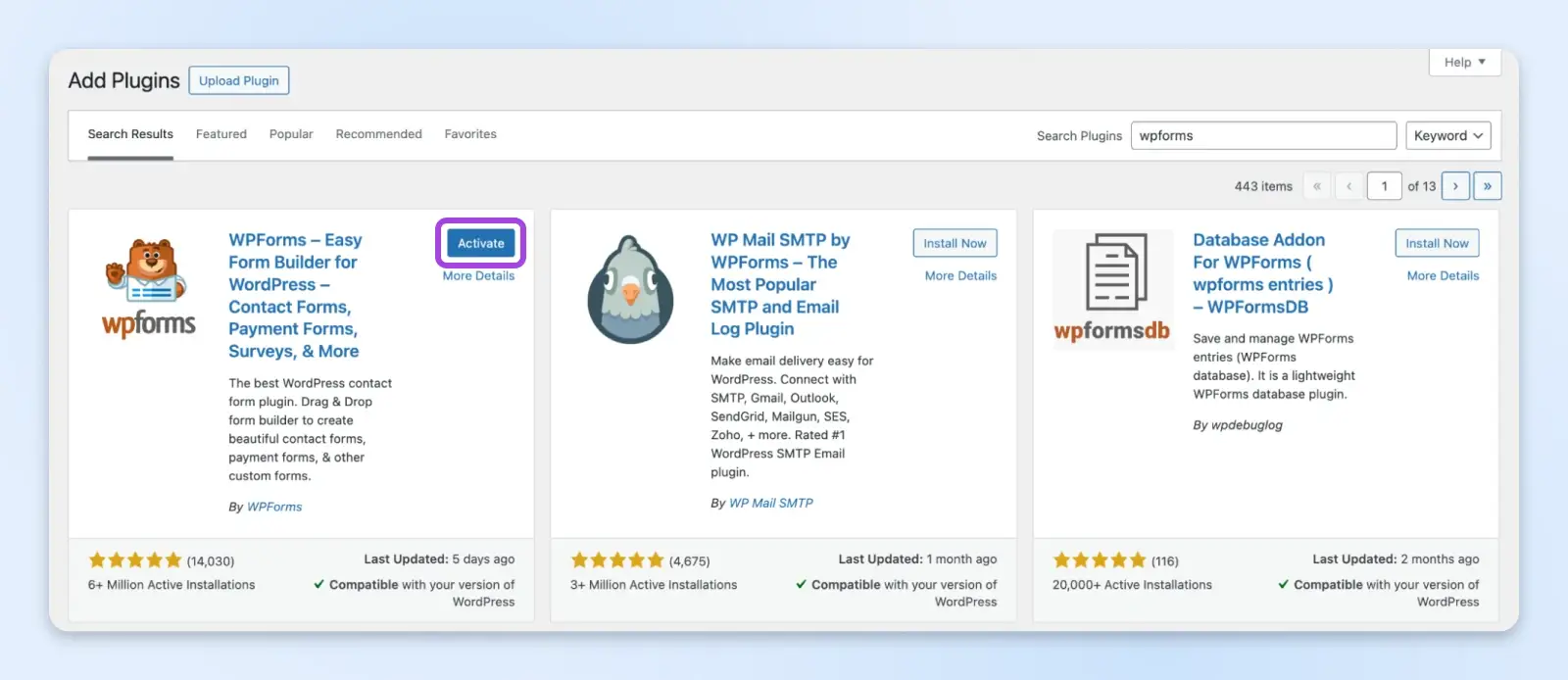 WordPress 安装完成后,点击启用。现在,WPForms 将出现在您的仪表板菜单中!