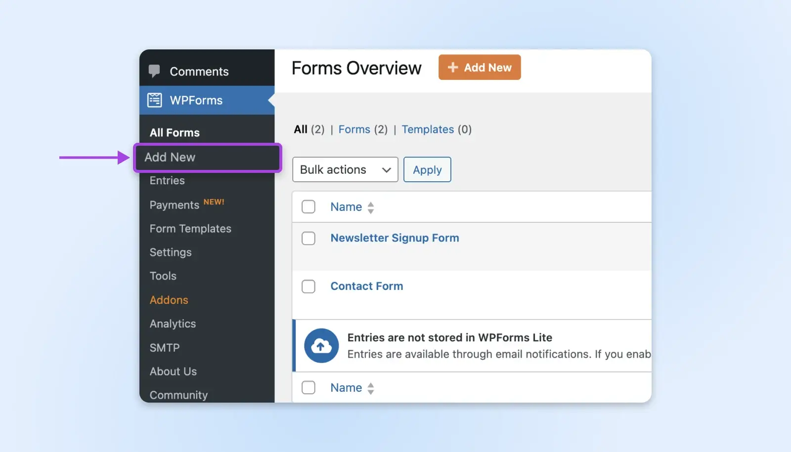 点击 WPForms 菜单链接,然后选择 Add New 表单。