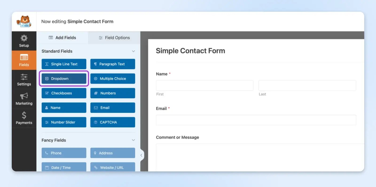 选择基本的联系表单开始。你会看到“Name”、“Email”等字段和一个大的信息文本框。