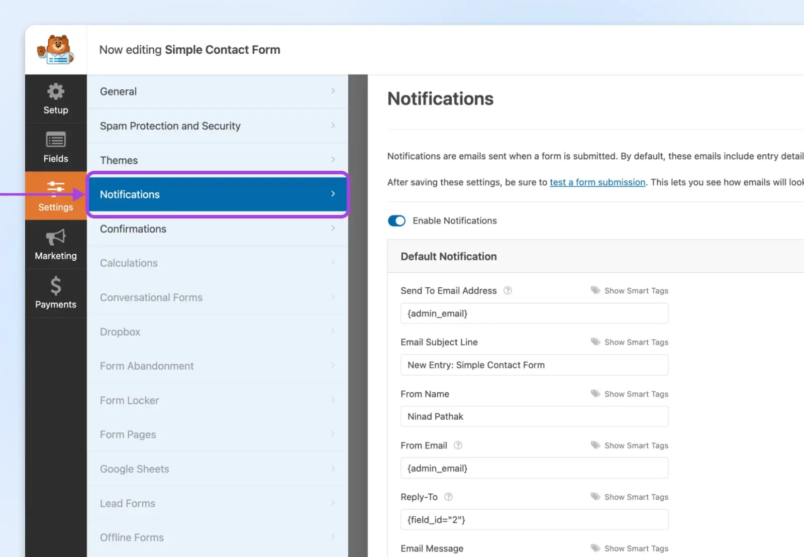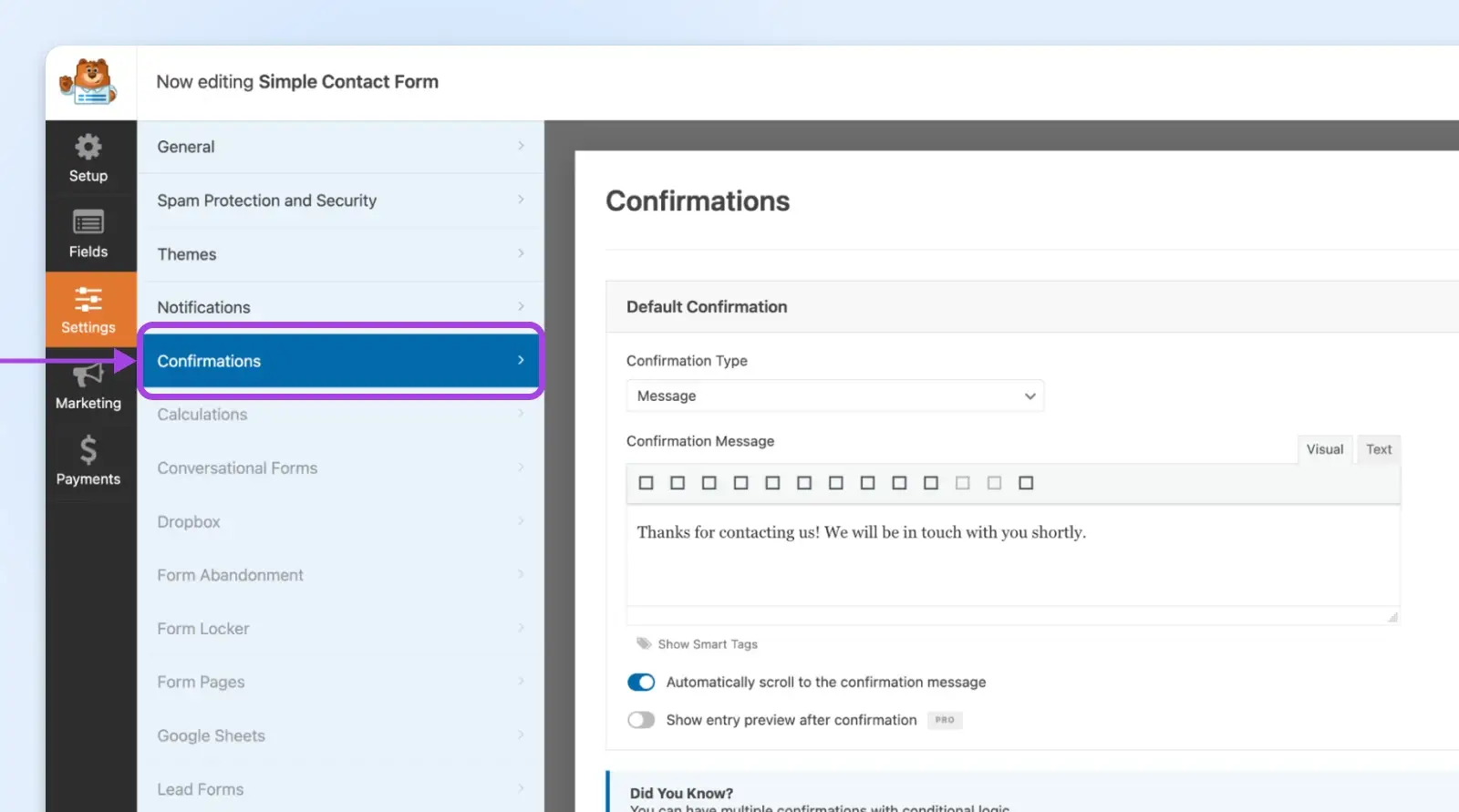 在表单生成器中选择 “Setting”。你会看到“Notifications”和“Confirmations”选项。
