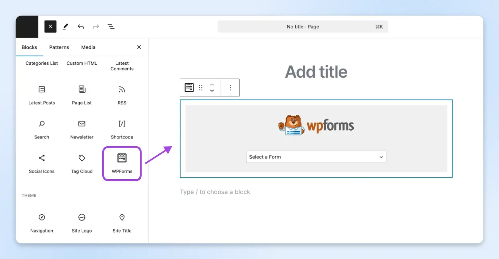 如果你使用的是区块编辑器,你会看到一个 WPForms 区块。插入它,然后从列表中选择表单。
