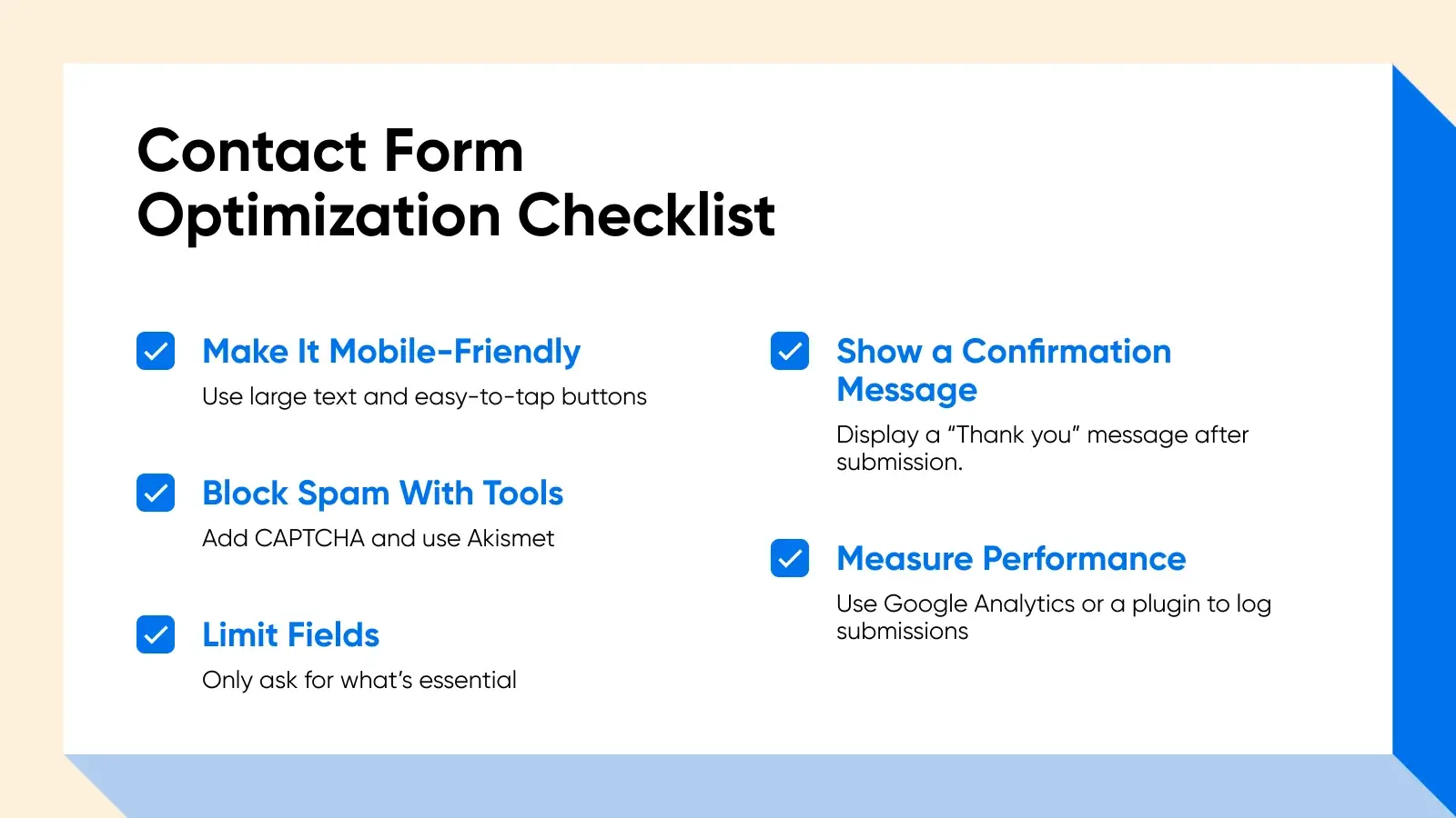 添加表单是第一步。优化表单可以增加有用线索的数量,减少垃圾邮件或混乱。以下是一些值得考虑的建议: