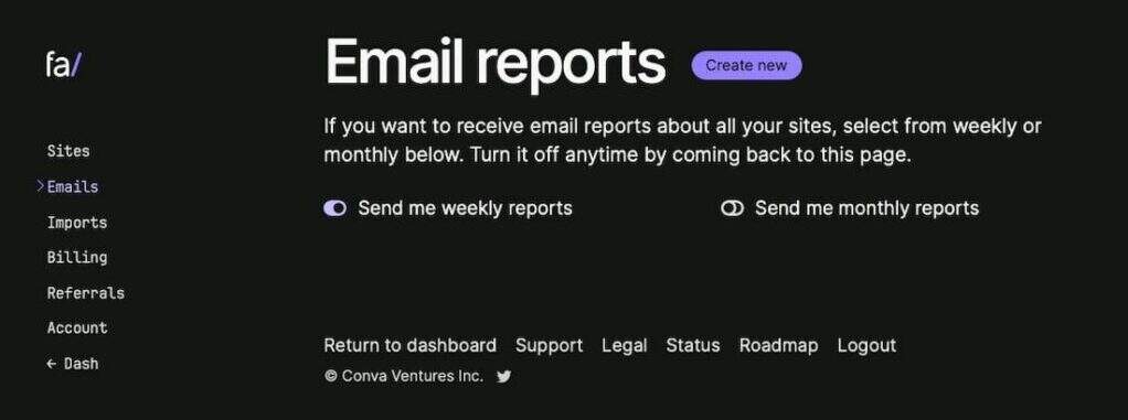 为了方便更新,Fathom 提供了设置自动电子邮件报告的选项。这些报告可以每周或每月安排一次,让您定期了解网站的性能,而无需手动检查仪表盘。