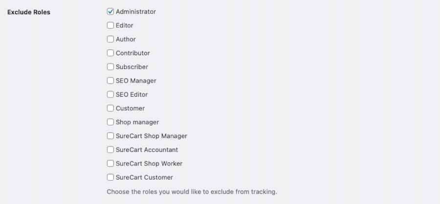 决定是否要排除网站上跟踪的某些用户角色。这有助于防止内部流量导致数据偏差。