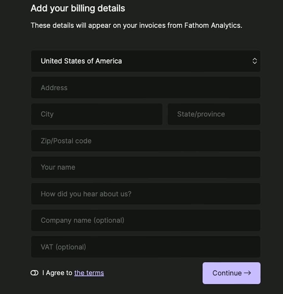 首先,转到 Fathom Analytics 注册页面。然后,填写您的电子邮件地址、创建密码并提供您的付款信息。单击 Create your account。
