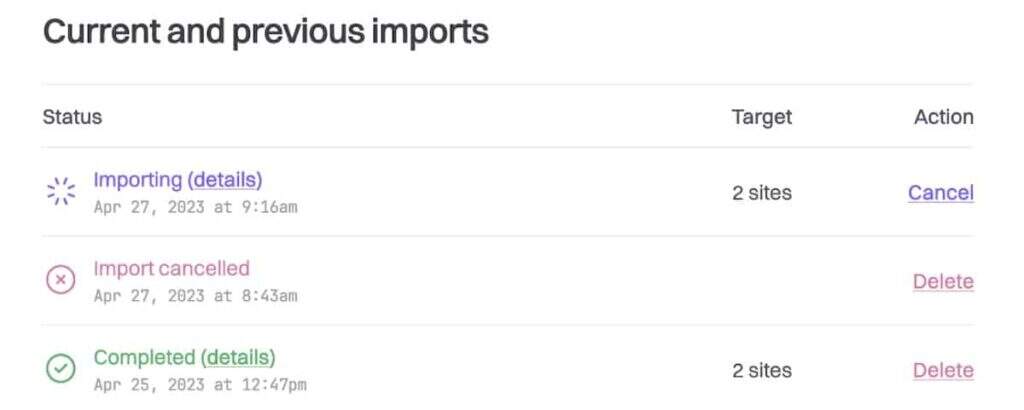然后,您将在“Imports”部分下看到排队、进行中和已完成的导入。