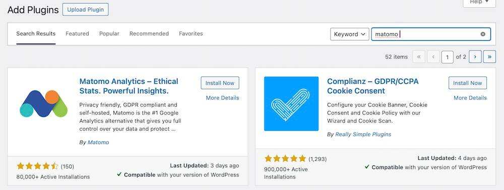 1. 从 WordPress 目录下载 Connect Matomo 插件,或在 WordPress 面板的插件 > 安装新插件中搜索。