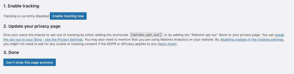 插件启用后,进入仪表盘中的 Matomo Analytics > Get Started,然后单击 Enable tracking now,允许它开始收集数据。