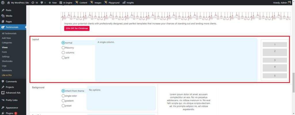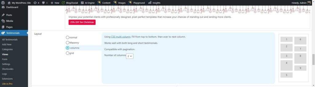 Strong Testimonial 插件提供多种布局来显示您的评价,包括 Normal, Masonry, Columns, 和 Grid。下面是简要概述:
