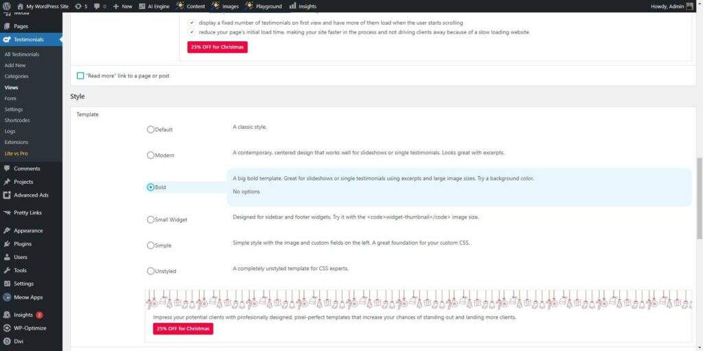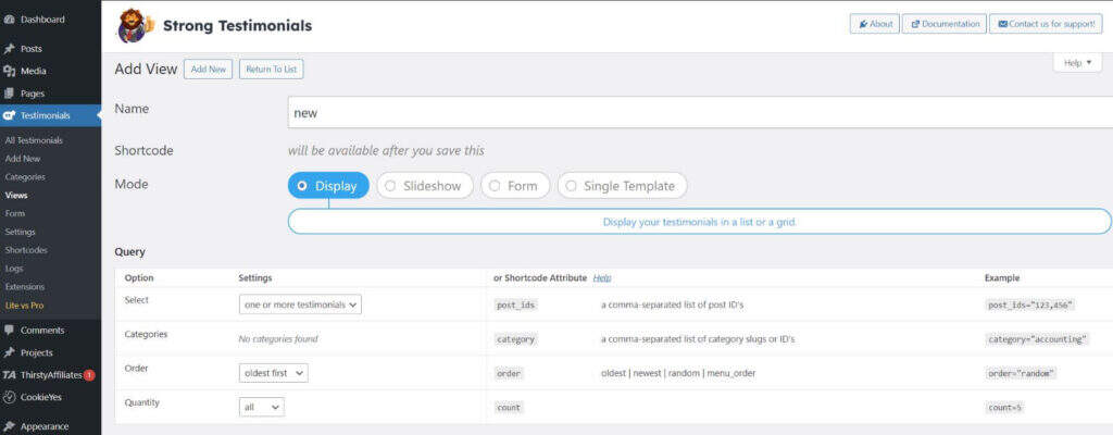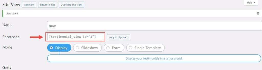 创建一个或多个评价后,导航至 Testimonials > Views。在这里你有一系列选项来管理评价和表单的显示选项。选择“Display”模式可以让视图以列表或网格布局显示评价。您还可以选择其他模式,包括幻灯片、表单或单一模板。