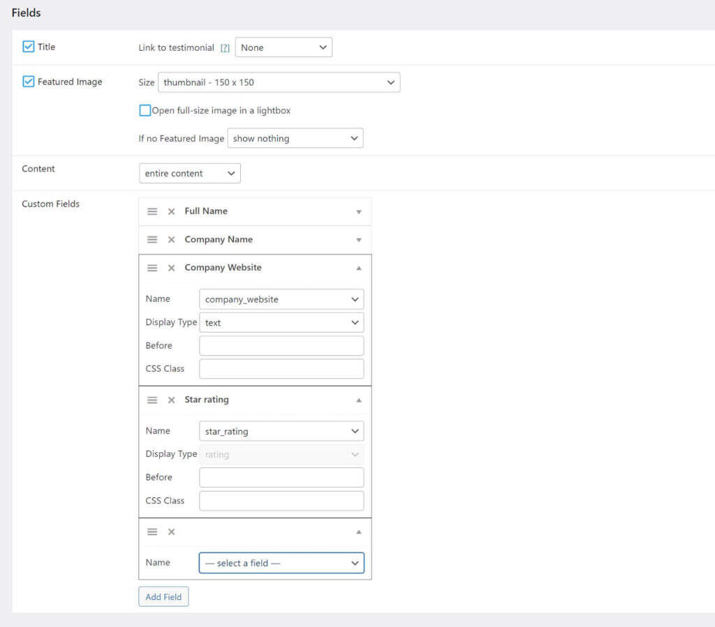 您甚至可以选择要在评价视图中包含哪些自定义字段。如果您想显示更多评价信息,可以添加自定义字段,如姓名、公司名称、网站、星级等。这些字段将动态显示内容。