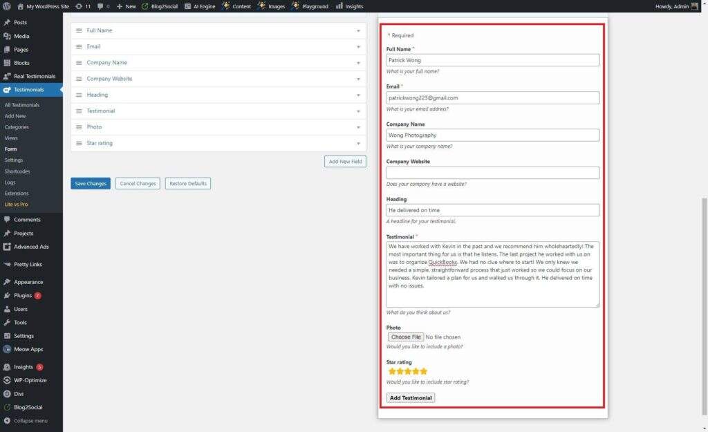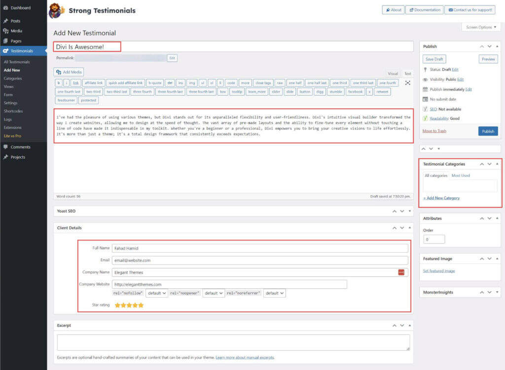 Strong Testimonials 为创建评价提交表单提供了用户友好界面。您可以根据自己的要求定制这些表单,包括姓名、电子邮件、信息等字段,还可能包括其他自定义字段。