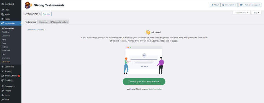 安装并激活 Strong Testimonials 插件后,系统会提示您创建第一个 Review。您可以点击绿色按钮或点击 WordPress 仪表板中“Add New”下的 “Testimonials”。