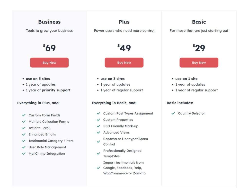 Strong Testimonials Plugin 提供三种定价方案:Basic 计划、Plus 计划和 Business 计划。