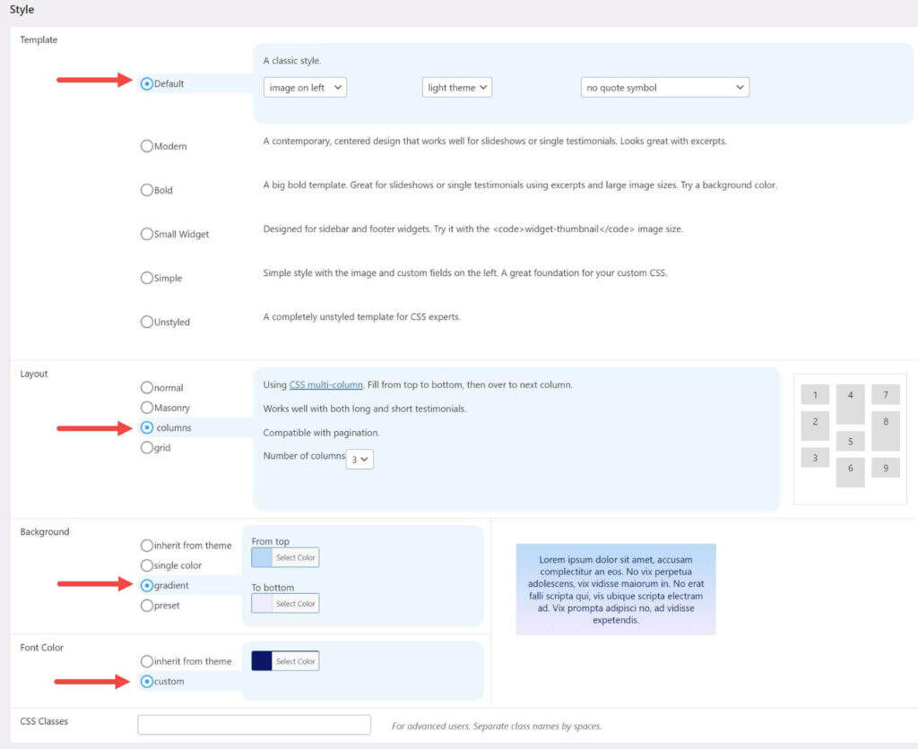 Strong Testimonials 插件提供了一些预制模板,带有背景和字体颜色的基本样式选项。这些模板包括: