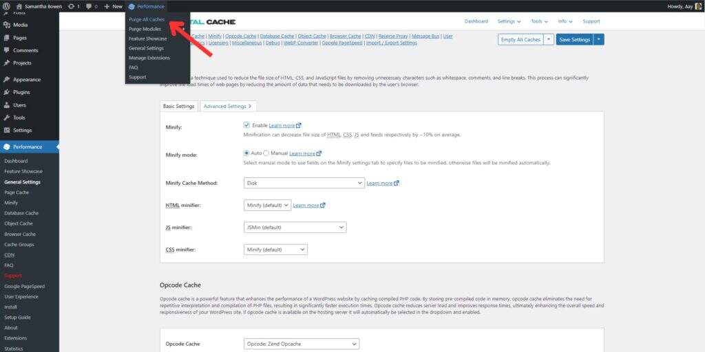 清除缓存意味着从头开始清除并重建所有已保存的缓存。此操作可确保所有人都能看到最近对网站所做的任何更改。虽然 W3TC 可配置为在发生更改时自动清除缓存,但如果网站布局出现故障,您也可能需要手动清除缓存。将鼠标悬停在顶部工具栏的 “Performance” 选项卡上,点击 “Purge All Caches” 选项即可清除缓存。