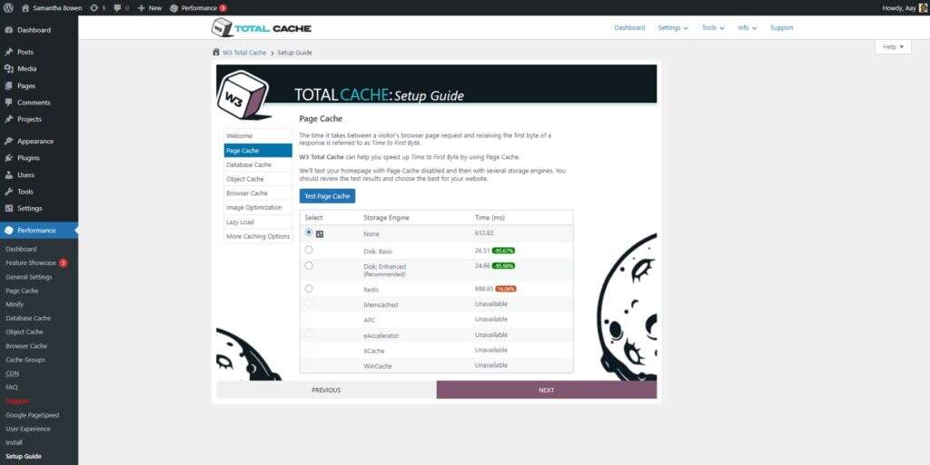 W3TC 缓存会进行各种测试,并允许你在运行其设置指南时为网站的多个方面选择不同的缓存方法。例如,在配置页面缓存时,您可以选择 “增强磁盘 ”方法。W3TC 还说明了选择不同策略时的速度差异。这简化了为网站设置选择最合适方法的过程。