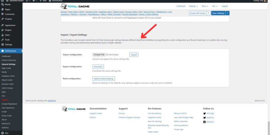 您可能很快就会发现,W3 Total Cache 的用户界面非常枯燥,选项也很复杂。要想充分发挥插件的潜力,你需要知识和运气的结合。在其他网站上重复设置过程可能会让你感到非常沮丧。在这种情况下,您只需点击几下,就能轻松导出所有设置并导入到其他网站。