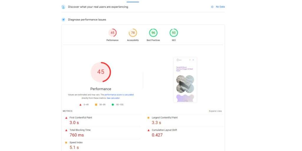根据 PageSpeed Insights,网站性能不达标,得分 45。加载时间为 5.1 秒,对于用户来说可能显得有些缓慢。以下是 Core Web Vitals 关键指标的简化明细: