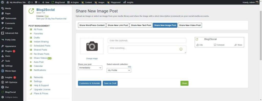 Blog2Social 界面简单,易于浏览。设计时尚,选项井然有序。该插件可与 WordPress 完美配合,让您可以在仪表盘上控制社交网络帖子。