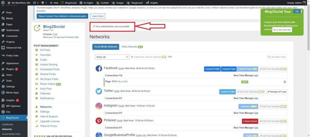 点击您希望整合的平台,然后根据提示授权 Blog2Social 访问并链接到您的社交媒体账户,确保无缝连接。在这种情况下,我决定用这个插件整合我的 Facebook 页面。