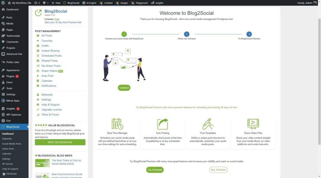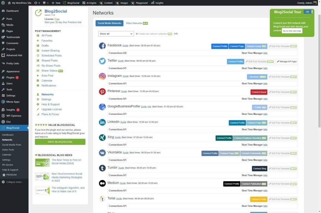 Blog2Social 是 WordPress 的社交媒体自动化插件,可简化在各种社交媒体平台上交叉推广和分享博客文章的工作。它是一款全面的工具,可简化博客、网站、企业和机构跨社交渠道的内容共享和受众参与。