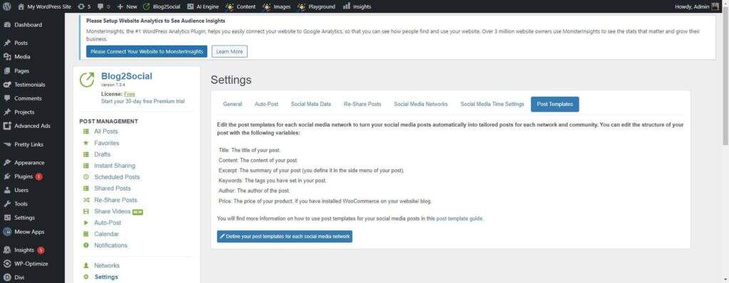 此外,Blog2Social 通过帖子模板简化了流程,让您可以为社交媒体内容创建独特的结构。利用标题、内容、摘录、关键词、作者和 WooCommerce 产品价格等变量,毫不费力地定制您的帖子模板。