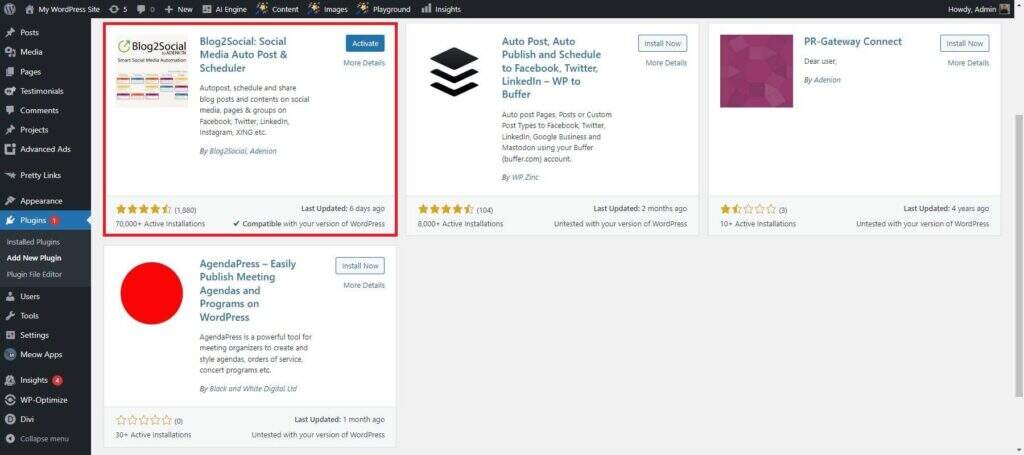 要设置 Blog2Social 插件,请下载并在 WordPress 博客上安装该插件。您可以上传 ZIP 文件或直接从 WordPress 管理面板安装。安装完成后,激活插件;您可以在左侧导航菜单中找到它。