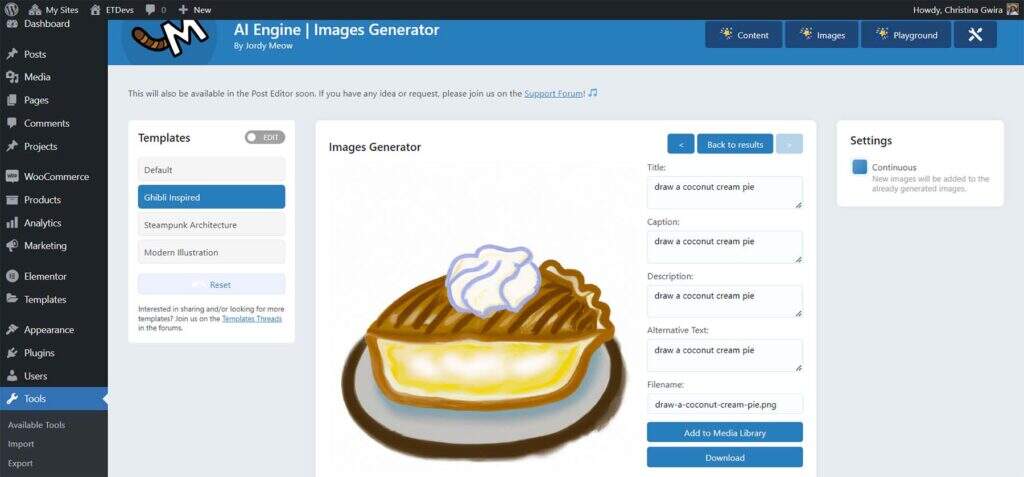要使用 AI Engine 图像生成器功能,请输入您要生成图像的文字说明。然后,AI 会根据您的描述为您生成图片。然后,您可以直接在 WordPress 网站上下载或使用该图片。