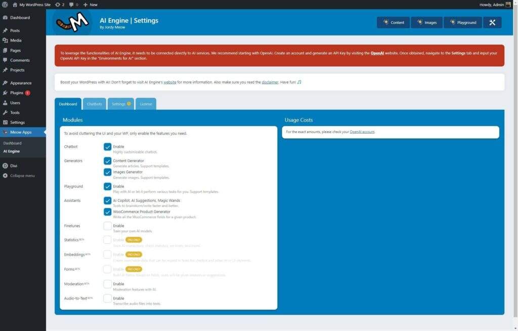 AI Engine 提供一系列高级功能来增强网站功能。这些功能包括聊天机器人、内容和图片生成、微调等。本简介将重点介绍该插件的主要功能和优点。