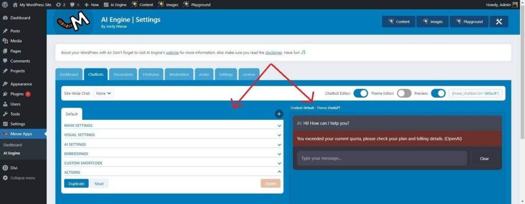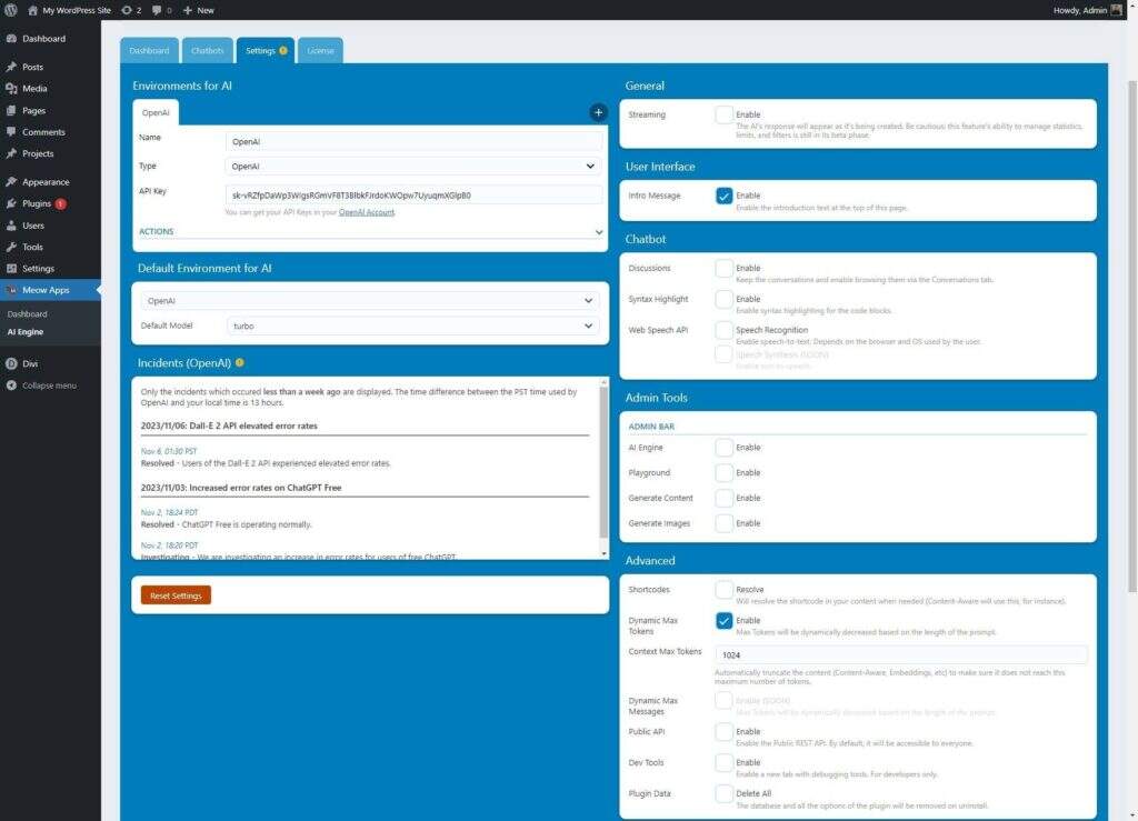 安装插件并获得 API 密钥后,您就可以在 WordPress 面板上配置插件设置了。您可以选择要使用的人工智能服务,设置聊天机器人,并根据自己的需要定制插件。