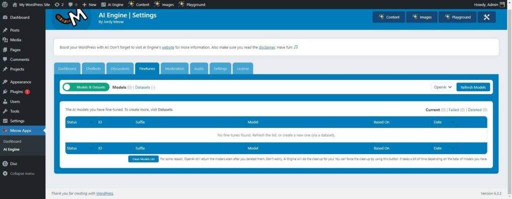 要对 AI Engine 中的人工智能模型进行微调,必须向人工智能提供文本和代码数据集。该数据集应尽可能大,并能代表您的需求。一旦为人工智能提供了数据集,就可以开始微调。这个过程可能需要几个小时或几天,具体取决于数据集的大小和复杂程度。微调过程完成后,您将拥有一个根据您的需求定制的新人工智能模型。然后,您就可以使用这个新的人工智能模型为 WordPress 网站上的 AI Engine 功能提供动力。