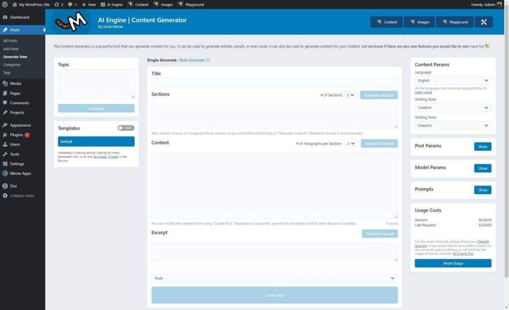 配置完成后,您就可以在 WordPress 网站上生成内容、创建聊天机器人并自动执行任务。您还可以跟踪人工智能的使用情况,并根据需要设置限制。