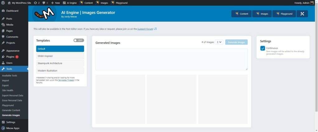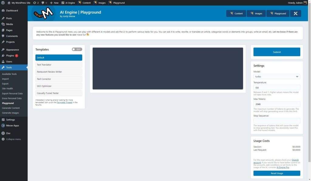 AI Engine 的 AI Playground 功能允许您以各种方式尝试使用 AI。这就像是在 WordPress 的仪表板上安装了 ChatGPT。您可以选择要使用的特定人工智能模型,并选择模板来帮助您开始使用。您可以用它来生成内容、翻译语言、撰写创意内容,以及非正式地回答您的问题。以下是您可以使用 AI Playground 功能做的一些事情: