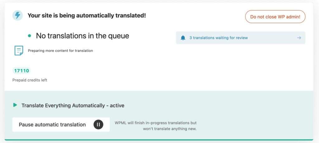 WPML 为用户提供的最佳功能之一是自动翻译。该功能基于信用系统运行,您的前 2000 个点数可以免费使用(购买 CMS 或代理计划时,信用点数会更多得多)。购买信用点数的起价为 6 欧元(8,000 个点数)。
